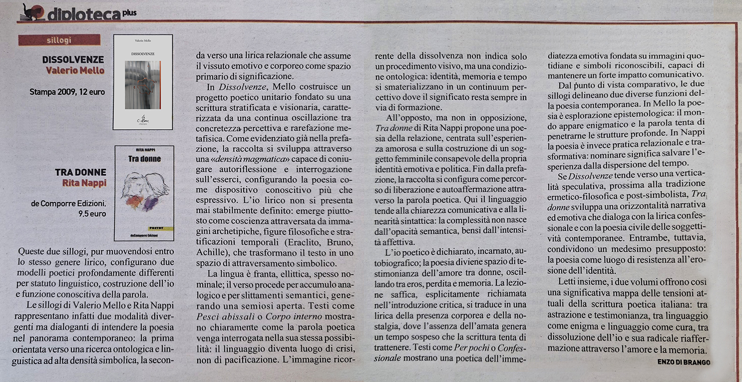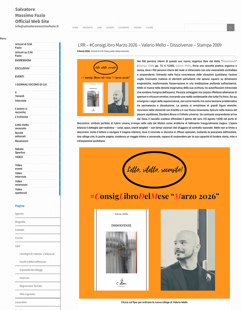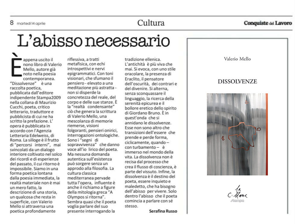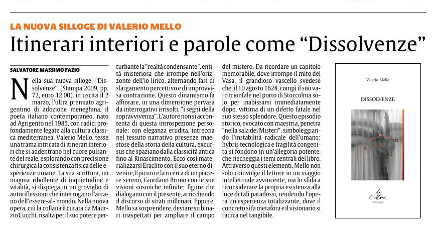 Nei fitti percorsi interni di questo suo nuovo, organico libro, Valerio Mello, entrando nel vivo dettaglio del reale, nella fisica concretezza delle situazioni, coglie anche utilmente l’insinuarsi inatteso di elementi che introducono toni di una controllata visionarietà. Eccolo allora muoversi, nella densità magmatica della sua inquieta scrittura, meditando, nell’intreccio di varie autoriflessioni, sull’enigma dell’esserci, che si riflette in percorsi scheggiati, ma al tempo stesso corposi. Tra le numerose immagini proposte, ci offre, per esempio, l’idea di una enigmatica «realtà condensante», che viene a turbare l’io lirico, con alternanze di aperture e chiusure, facendo emergere, pur nella loro dimensione problematica, «i segni della sopravvivenza». In questa opera, Mello riesce a coinvolgere grandi figure storiche della cultura, con incursioni anche nella classicità, facendo apparire, tra le numerose presenze evocate, Eraclito, Epicuro o Giordano Bruno. E, sorprendendoci, si muove poi su un piano del tutto diverso, con la citazione del mitico vascello svedese Vasa – il quale affondò nel porto di Stoccolma il giorno del varo, 10 agosto 1628 – che «entra nella sala dei Misteri».