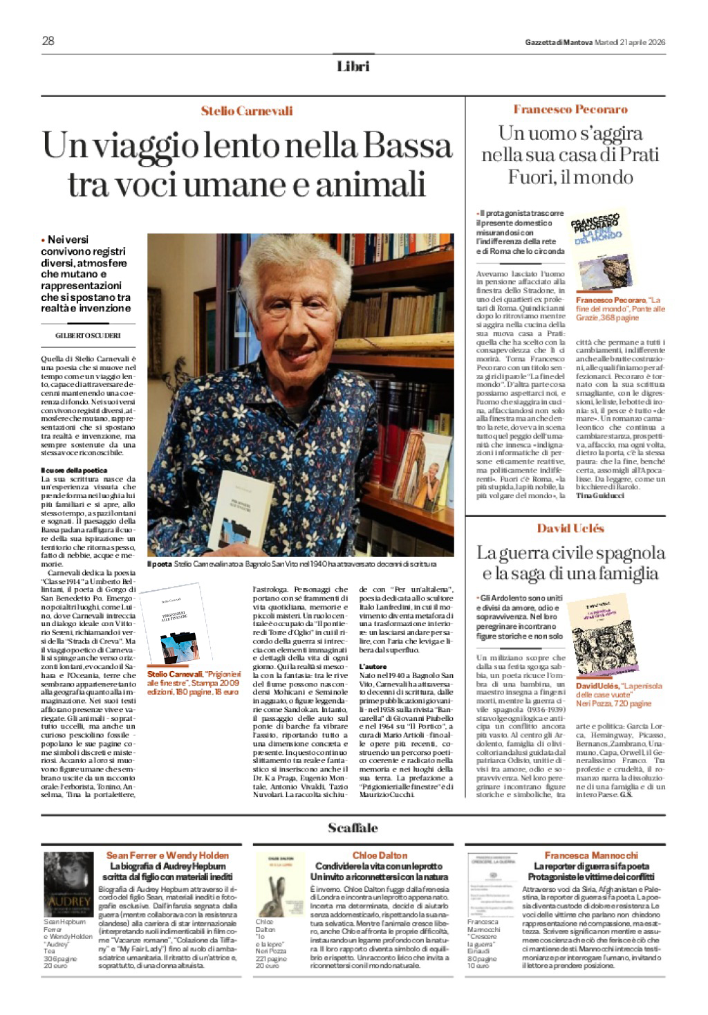 Una lunga vicenda di poesia, quella di Stelio Carnevali, vissuta volutamente nell’ombra e con lunghi periodi di silenzio, come il suo conterraneo e maestro Umberto Bellintani. In Prigionieri alle finestre il nostro si è finalmente deciso a rendere più nota la sua opera, ripercorrendone il cammino. Siamo condotti in un viaggio poetico che attraversa i decenni, con interna mobilità di situazioni e toni, ma con una omogeneità di fondo, che dà al libro il valore, oltre che di riscoperta, di vitale unitarietà. Ci troviamo a contatto con una lingua poetica di sobria medietà, che ci coinvolge con elementi di esperienza reale, passando per luoghi a lui familiari, dalla zona del Po, la sua terra, a una Luino dove ci fa ritrovare Sereni. Ma nel suo mondo espressivo entrano anche realtà geografiche molto lontane o alluse. Esperienza diretta e fantasia libera vengono a coesistere. Percorrendo la raccolta possiamo imbatterci in presenze animali, un martin pescatore, un pesciolino fossile, «merlotti abbandonati»… o umane, come il Tonino o l’Anselma, «il pontiere di Torre d’Oglio», facendo peraltro balenare un Dr. K. a Praga, nonché un Montale o un Vivaldi. Oppure, un Tazio Nuvolari nel 1938