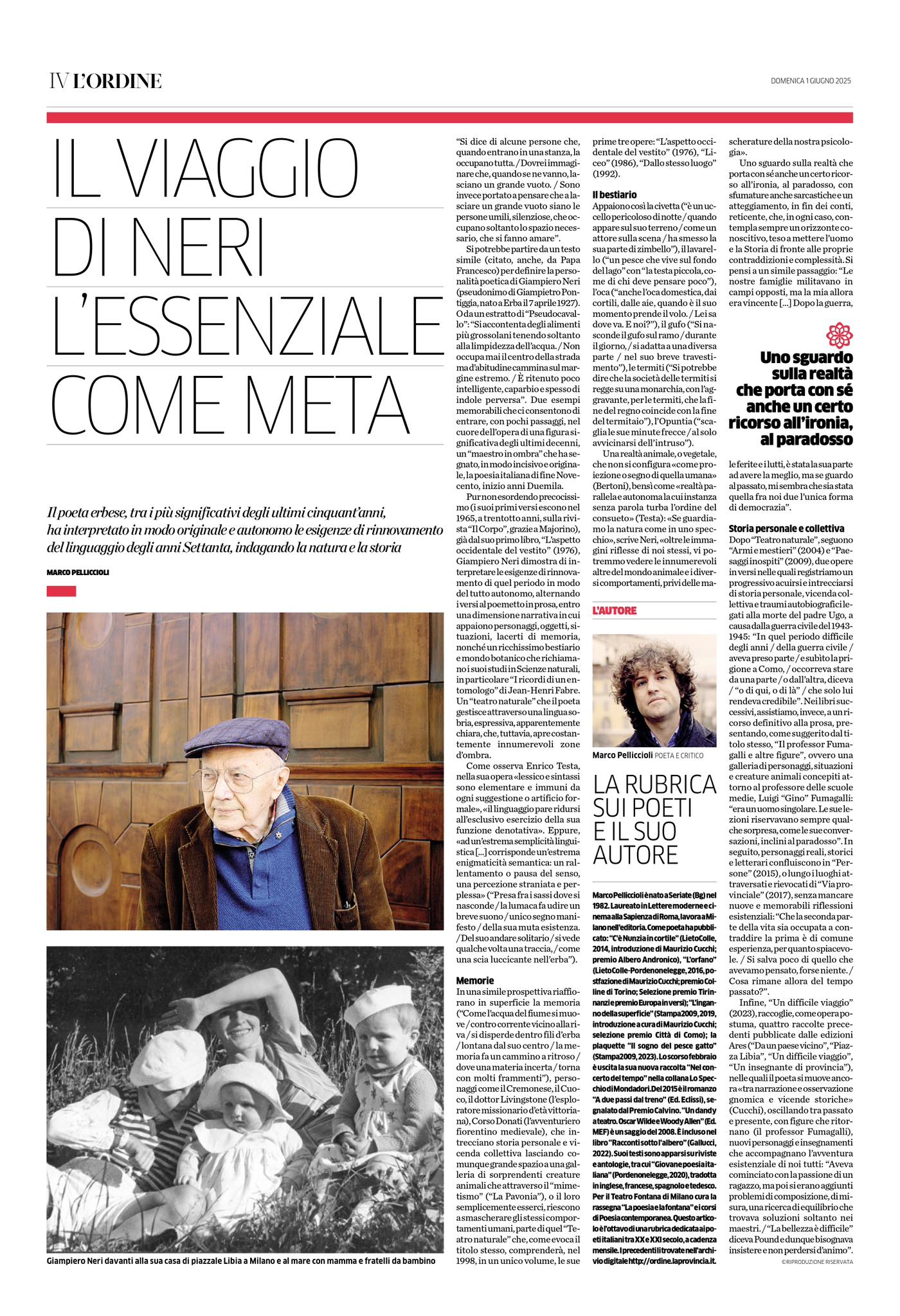 Giampiero Neri (Erba 7/4/1927 – Milano 15/2/2023), pseudonimo di Giampietro Pontiggia, dopo il liceo scientifico si iscrive alla Facoltà di Scienze Naturali senza terminare gli studi. Pubblica le sue prime poesie nel 1965 sulla rivista «Il Corpo» diretta da G. Majorino e nel 1972, con introduzione di Raboni, sull’«Almanacco dello Specchio» (Mondadori). Seguono, tra gli altri, L’aspetto occidentale del vestito (Guanda, 1976), Liceo (Acquario-Guanda, 1986) e Dallo stesso luogo (Coliseum, 1992); per Mondadori Teatro naturale (1998, Pr. Brancati), Paesaggi inospiti (2009, Pr. A. Gatto), Il professor Fumagalli e altre figure (2012, Premio Maconi 2013); per Garzanti Antologia personale (2022). Nel 2020-22, per le Edizioni Ares, i quattro volumetti qui interamente ripresi.